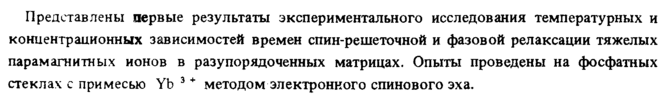 Представлены первые результаты экспериментального исследования температурных и концентрационных зависимостей времен спин-решеточной и фазовой релаксации тяжелых парамагнитных ионов в раз упорядоченных матрицах. Опыты проведены на фосфатных стеклах с примесью Yb 3 + методом электронного спинового эха.