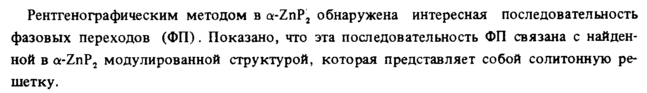 Рентгенографическим методом в α-ΖηΡ2 обнаружена интересная последовательность фазовых переходов (ФП). Показано, что эта последовательность ФП связана с найденной в α-ΖηΡ2 модулированной структурой, которая представляет собой солитонную решетку.