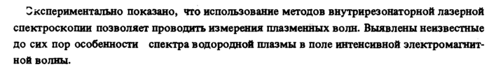Экспериментально показано, что использование методов внутрирезонаторной лазерной спектроскопии позволяет проводить измерения плазменных волн. Выявлены неизвестные до сих пор особенности спектра водородной плазмы в поле интенсивной электромагнитной волны.