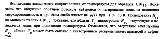Исследована зависимость сопротивления от температуры для образцов UBe13. Показано, что облучение образцов потоком нейтронов и легирование железом подавляет сверхпроводимость и при этом слабо влияет на р(Т) при Τ > 30 К. Исследование Η на монокристаллах UBej 3 показало, что вблизи Τ анизотропия Η отсутствует и по- С С 2 является лишь при понижении температуры. Отмечается, что отсутствие анизотропии Нс^ вблизи Тс может быть связано с анизотропным распределением примесей и дефектов.