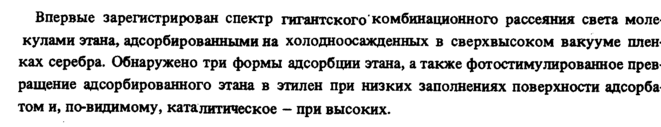 Впервые зарегистрирован спектр гигантского комбинационного рассеяния света моле кулами этана, адсорбированными на холодноосажденных в сверхвысоком вакууме плен ках серебра. Обнаружено три формы адсорбции этана, а также фотостимулированное прев ращение адсорбированного этана в этилен при низких заполнениях поверхности адсорба том и, по-видимому, каталитическое при высоких.