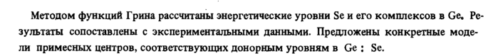 Методом функций Грина рассчитаны энергетические уровни Se и его комплексов в Gee Результаты сопоставлены с экспериментальными данными. Предложены конкретные модели примесных центров, соответствующих донорным уровням в Ge : Se.