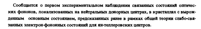 Сообщается о первом экспериментальном наблюдении связанных состояний оптических фононов, локализованных на нейтральных донорных центрах, в кристаллах с вырожденным основным состоянием, предсказанных ранее в рамках общей теории слабо-связанных электрон-фононных состояний для ян-теллеровских центров.