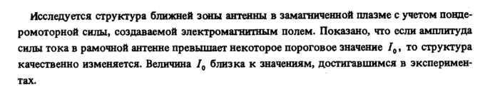 Исследуется структура ближней зоны антенны в замагниченной плазме с учетом понде-ромоторной силы, создаваемой электромагнитным полем. Показано, что если амплитуда силы тока в рамочной антенне превышает некоторое пороговое значение /0, то структура качественно изменяется. Величина /0 близка к значениям, достигавшимся в экспериментах.