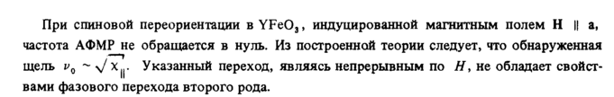 При спиновой переориентации в YFe03, индуцированной магнитным полем Η || а, частота АФМР не обращается в нуль. Из построенной теории следует, что обнаруженная щель vQ ~ Указанный переход, являясь непрерывным по Я, не обладает свойст- вами фазового перехода второго рода.