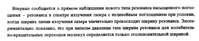 Впервые сообщается о прямом наблюдении нового типа резонанса насыщенного поглощения резонанса в спектре излучения лазера с нелинейным поглощением при условии, когда ширина линии излучения лазера значительно превосходит ширину резонанса. Экспериментально показано, что при низком давлении газа ширина резонанса для колебательно-вращательных переходов молекул определяется только столкновительной шириной.