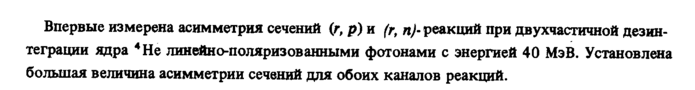 Впервые измерена асимметрия сечений (г, р) и (г, η)· реакций при двухчастичной дезинтеграции ядра 4Не линейно-поляризованными фотонами с энергией 40 МэВ. Установлена большая величина асимметрии сечений для обоих каналов реакций.