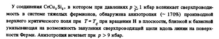 У соединения CeCu3 Si2, в котором при давлениях ρ >, 1 кбар возникает сверхпроводимость в системе тяжелых фермионов, обнаружена анизотропия (~ 170%) производной верхнего критического поля при ТаТ при вращении Η в плоскости, близкой к базисной С указывающая на возможность зануления сверхпроводящей щели вдоль линии на поверхности Ферми. Анизотропия исчезает при ρ > 9 кбар.