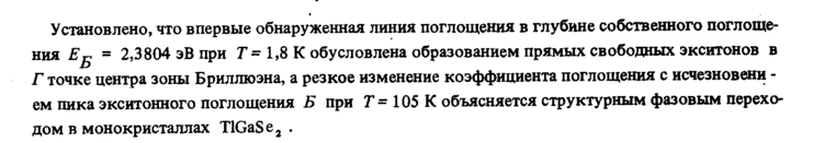 Установлено, что впервые обнаруженная линия поглощения в глубине собственного поглощения ЕБ = 2,3804 эВ при Τ = 1,8 К обусловлена образованием прямых свободных экситонов в Г точке центра зоны Бриллюэна, а резкое изменение коэффициента поглощения с исчезновени -ем пика экситонного поглощения Б при Т= 105 К объясняется структурным фазовым переходом в монокристаллах TlGaSe2 .