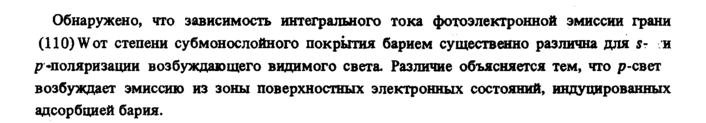 Обнаружено, что зависимость интегрального тока фотоэлектронной эмиссии грани (ПО)Wot степени субмонослойного покрытия барием существенно различна для sи ρ •поляризации возбуждающего видимого света. Различие объясняется тем, что р-свет возбуждает эмиссию из зоны поверхностных электронных состояний, индуцированных адсорбцией бария.