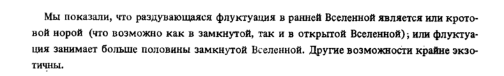 Мы показали, что раздувающаяся флуктуация в ранней Вселенной является или кротовой норой (что возможно как в замкнутой, так и в открытой Вселенной) -, или флуктуация занимает больше половины замкнутой Вселенной. Другие возможности крайне экзотичны.