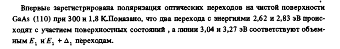 Впервые зарегистрирована поляризация оптических переходов на чистой поверхности GaAs (ПО) при 300 и 1,8 КЛоказано, что два перехода с энергиями 2,62 и 2,83 эВ происходят с участием поверхностных состояний , а линии 3,04 и 3,27 эВ соответствуют объемным Ех нЕ1 +ΔΧ переходам.