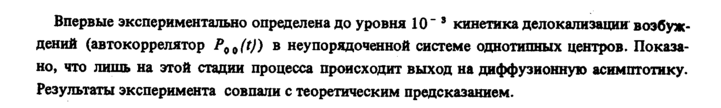 Впервые экспериментально определена до уровня 10 " 3 кинетика делокализации возбуждений (автокоррелятор Р00(ф в неупорядоченной системе однотипных центров. Показано, что лишь на этой стадии процесса происходит выход на диффузионную асимптотику. Результаты эксперимента совпали с теоретическим предсказанием.