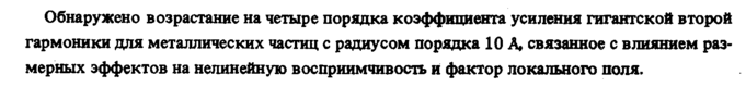 Обнаружено возрастание на четыре порядка коэффициента усиления гигантской второй гармоники для металлических частиц с радиусом порядка 10 А, связанное с влиянием размерных эффектов на нелинейную восприимчивость и фактор локального поля.