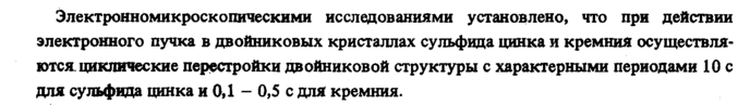 Электронномикроскопическими исследованиями установлено, что при действии электронного пучка в двойниковых кристаллах сульфида цинка и кремния осуществляются циклические перестройки двойниковой структуры с характерными периодами 10 с для сульфида цинка и 0,1 0,5 с для кремния.
