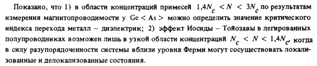 Показано, что 1) в области концентраций примесей 1,47V <N < 3N по результатам измерения магнитопроводимости у Ge < As > можно определить значение критического индекса перехода металл диэлектрик; 2) эффект Иосиды Тойозавы в легированных полупроводниках возможен лишь в узкой области концентраций Nc < Ν < 1,4Л^ когда в силу разупорядоченности системы вблизи уровня Ферми могут сосуществовать локализованные и делокализованные состояния.