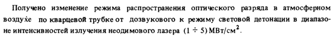 Получено изменение режима распространения оптического разряда в атмосферном воздухе по кварцевой трубке от дозвукового к режиму световой детонации в диапазо-не интенсивностей излучения неодимового лазера (1 + 5) МВт/см .