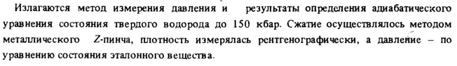 Излагаются метод измерения давления и результаты определения адиабатического уравнения состояния твердого водорода до 150 кбар. Сжатие осуществлялось методом металлического Z-пинча, плотность измерялась рентгенографически, а давление по уравнению состояния эталонного вещества.