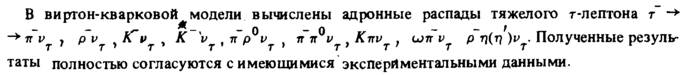 В виртон-кварковой^модели вычислены адронные распады тяжелого т-лептона г -> ■+iri> j р ντ > ^"ντ » ^ ντ ' π ^ντ » π **ντ } ^πντ } ωπ ντ ρ η^ ^ντ' Полученные результаты полностью согласуются с имеющимися экспериментальными данными.