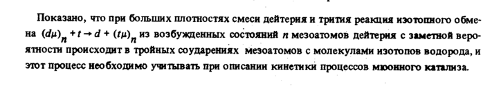 Показано, что при больших плотностях смеси дейтерия и трития реакция изотопного обмена (άμ)η +t-*d + (ίμ)η из возбужденных состояний η мезоатомов дейтерия с заметной вероятности происходит в тройных соударениях мезоатомов с молекулами изотопов водорода, и этот процесс необходимо учитывать при описании кинетики процессов мюонного катализа.