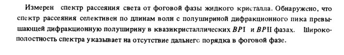 Измерен спектр рассеяния света от фоговой фазы жидкого кристалла. Обнаружено, что спектр рассеяния селективен по длинам волн с полушириной дифракционного пика превышающей дифракционную полуширину в квазикристаллических ВР\ и BPU фазах. Широко-полостность спектра указьюает на отсутствие дальнего порядка в фоговой фазе.