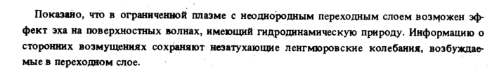 Показано, что в ограниченной плазме с неоднородным переходным слоем возможен эффект эха на поверхностных волнах, имеющий гидродинамическую природу. Информацию о сторонних возмущениях сохраняют незатухающие ленгмюровские колебания, возбуждаемые в переходном слое.