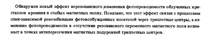 Обнаружен новый эффект не резонансного изменения фотопроводимости облученных кристаллов кремния в слабых магнитных полях. Показано, что этот эффект связан с процессами спин-зависимой рекомбинации фотовозбужденных носителей через триплетные центры, а изменение фотопроводимости в отсутствии резонансного переменного магнитного поля возникает в точках антипересечения магнитных подуровней триплетных центров.