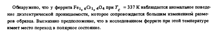 Обнаружено, что у феррита Fei бСг1 4О4 ПРИ тг = 337 К наблюдается аномальное поведе-ние диэлектрической проницаемости, которое сопровождается большим изменением размеров образца. Высказано предположение, что в исследованном феррите при этой температуре имеет место переход в полярное состояние.