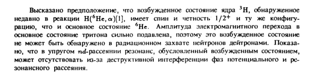 Высказано предположение, что возбужденное состояние ядра 3Н, обнаруженное недавно в реакции Н(6Не,а)[1], имеет спин и четность 1/2+ и ту же конфигурацию, что и основное состояние 6Не. Амплитуда электромагнитного перехода в основное состояние тритона сильно подавлена, поэтому это возбужденное состояние не может быть обнаружено в радиационном захвате нейтронов дейтронами. Показано, что в упругом nci-рассеянии резонанс, обусловленный возбужденным состоянием, может отсутствовать из-за деструктивной интерференции фаз потенциального и резонансного рассеяния.