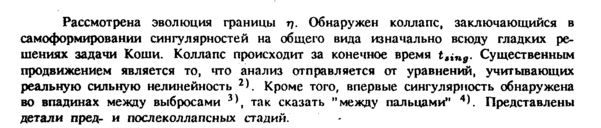 Рассмотрена эволюция границы η. Обнаружен коллапс, заключающийся в самоформировании сингулярностей на общего вида изначально всюду гладких решениях задачи Коши. Коллапс происходит за конечное время tM«ff. Существенным продвижением является то, что анализ отправляется от уравнений, учитывающих реальную сильную нелинейность 2). Кроме того, впервые сингулярность обнаружена во впадинах между выбросами *\ так сказать "между пальцами*' 4). Представлены детали преди послеколлаленых стадий.