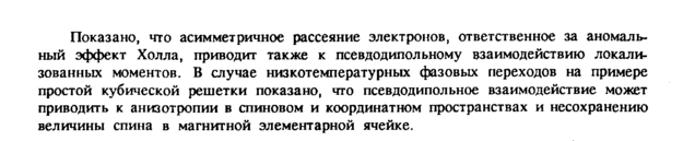 Показано, что асимметричное рассеяние электронов, ответственное за аномальный эффект Холла, приводит также к псевдодипольному взаимодействию локализованных моментов. В случае низкотемпературных фазовых переходов на примере простой кубической решетки показано, что псевдодипольное взаимодействие может приводить к анизотропии в спиновом и координатном пространствах и несохранению величины спина в магнитной элементарной ячейке.