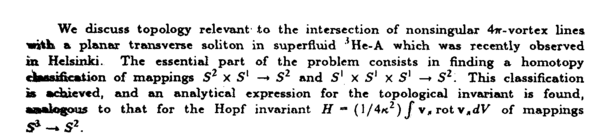 We discuss topology relevant to the intersection of nonsingular 4jr-vortex lines wxtb & planar transverse soli ton in superfluid -1He-A which was recently observed in Helsinki. The essential part of the problem consists in finding a ho mot ору classification of mappings 52 X 5l -· S2 and S\ Χ 51 Χ 51 -» S2. This classification is achieved, and an analytical expression for the topological invariant is found, analogous to that for the Hopf invariant Η (1/4/c2) J v„ rotv„dV of mappings