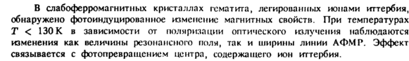 В слабоферромагнитных кристаллах гематита, легированных ионами иттербия, обнаружено фотоиндуцированное изменение магнитных свойств. При температурах Τ < 130 К в зависимости от поляризации оптического излучения наблюдаются изменения как величины резонансного поля, так и ширины линии АФМР. Эффект связывается с фотопревращением центра, содержащего ион иттербия.