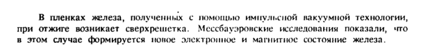В пленках железа, полученных с помощью импульсной вакуумной технологии, при отжиге возникает сверхрешетка. Мессбауэровские исследования показали, что в этом случае формируется новое электронное и магнитное состояние железа.