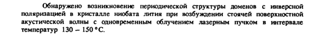 Обнаружено возникновение периодической структуры доменов с инверсной поляризацией в кристалле ниобата лития при возбуждении стоячей поверхностной акустической волны с одновременным облучением лазерным пучком в интервале температур 130150° С.