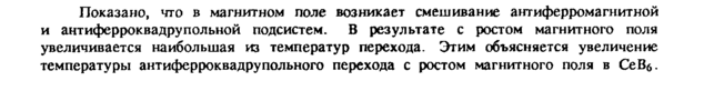 Показано, что в магнитном поле возникает смешивание антиферромагнитной и антиферроквадрупольной подсистем. В результате с ростом магнитного поля увеличивается наибольшая из температур перехода. Этим объясняется увеличение температуры антиферроквадрупольного перехода с ростом магнитного поля в СеВб-