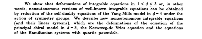 We show that deformations of integrable equations in 1 < d < 3 or, in other words, nonautonomous versions of well-known integrable equations can be obtained by reduction of the self-duality equations of the Yang-Mills model in d 4 under the action of symmetry groups. We describe new nonautonomous integrable equations (and their linear systems), which are the deformations of the equation of the principal chiral model in d *■ 3, the Korteweg-de Vries equation and the equations of the Hamilton!an systems with quartic potentials.