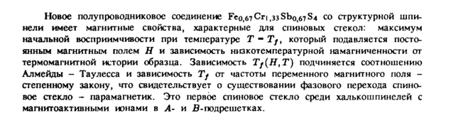 Новое полупроводниковое соединение Feo,67Cri ,338^,6754 со структурной шпинели имеет магнитные свойства, характерные для спиновых стекол: максимум начальной восприимчивости при температуре X Tf, который подавляется постоянным магнитным полем Η и зависимость низкотемпературной намагниченности от термомагнитной истории образца. Зависимость Tf(H,T) подчиняется соотношению Алмейды Таулесса и зависимость Tf от частоты переменного магнитного поля -степенному закону, что свидетельствует о существовании фазового перехода спиновое стекло парамагнетик. Это первое спиновое стекло среди халькошпинелей с магнитоактивными ионами в Ли В-подрешетках.