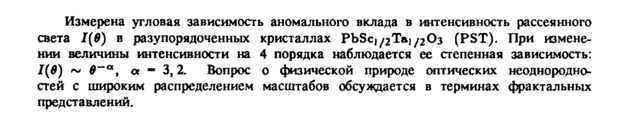 Измерена угловая зависимость аномального вклада в интенсивность рассеянного света 1(B) в разупорядоченных кристаллах РЬБс^Та^Оз (PST). При изменении величины интенсивности на 4 порядка наблюдается ее степенная зависимость: 1(0) ~ $~а, а 3,2. Вопрос о физической природе оптических неоднородно-стей с широким распределением масштабов обсуждается в терминах фрактальных представлений.