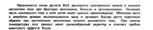 Предлагается схема расчета ΒΑΧ двумерного электронного канала в сильном магнитном поле при факторах заполнения, близких к целочисленным. Основная часть холловского тока в этой схеме имеет краевое происхождение. Объемная часть в линейном режиме экспоненциально мала и начинает быстро расти пороговым образом при постепенном увеличении полного холловского тока. При низких температурах этот процесс носит скачкообразный характер и отвечает пробою квантового эффекта Холла.