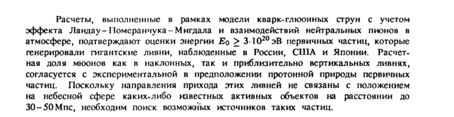 Расчеты, выполненные в рамках модели кварк-глюонных струн с учетом эффекта ЛандауПомеранчука-Мигдала и взаимодействий нейтральных пионов в атмосфере, подтверждают оценки энергии Eq > 3-1020эВ первичных частиц, которые генерировали гигантские ливни, наблюденные в России, США и Японии. Расчетная доля мюонов как в наклонных, так и приблизительно вертикальных ливнях, согласуется с экспериментальной в предположении протонной природы первичных частиц. Поскольку направления прихода этих ливней не связаны с положением на небесной сфере каких-либо известных активных объектов на расстоянии до 30-50Мпс, необходим поиск возможных источников таких частиц.