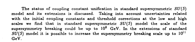 The status of coupling constant unification in standard supcrsymmctric SU(5) model and its extensions is discussed. Taking into account uncertainties related with the initial coupling constants and threshold corrections at the low and high scales we find that in standard supersymmctric SU(5) model the scale of the supersymmetry breaking could be up to 108 GeV. In the extensions of standard 517(5) model it is possible to increase the supersymmetry breaking scale up to 10" GeV.