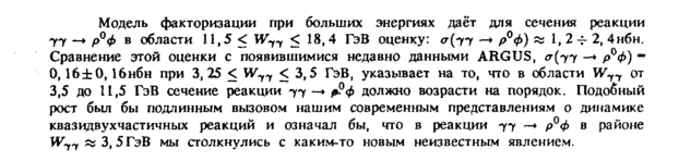 Модель факторизации при больших энергиях даёт для сечения реакции 77 —» р°ф в области 11,5 < Wyy < 18,4 ГэВ оценку: а[уу —» р°ф) % 1, 2-~ 2, 4нбн. Сравнение этой оценки с появившимися недавно данными ARGUS, <χ(77 —» р*ф) -0,16± 0,16нбн при 3, 25 < \νΊΊ < 3,5 ГэВ, указывает на то, что в области Wyy от 3,5 до 11,5 ГэВ сечение реакции 77 —» р?ф должно возрасти на порядок. Подобный рост был бы подлинным вызовом нашим современным представлениям о динамике квазидвухчастичных реакций и означал бы, что в реакции 77 ~» р°ф в районе Wy<y & 3, 5ГэВ мы столкнулись с каким-то новым неизвестным явлением.