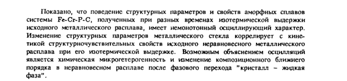 Показано, что поведение структурных параметров и свойств аморфных сплавов системы Fe-Cr-P-C, полученных при разных временах изотермической выдержки исходного металлического расплава, имеет немонотонный осциллирующий характер. Изменение структурных параметров металлического стекла коррелирует с кинетикой структурночувствительных свойств исходного неравновесного металлического расплава при его изотермической выдержке. Возможным объяснением осцилляции является химическая микрогетерогенность и изменение композиционного ближнего порядка в неравновесном расплаве после фазового перехода "кристалл жидкая фаза".