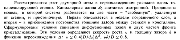 Рассматривается рост двумерной иглы в переохлажденном расплаве вдоль теплоизолирующей стенки. Капиллярная длина do считается изотропной. Предложена модель, в которой система разбивается на две части "свободную", удаленную от стенки, и пристеночную. Первая описывается в модели пограничного слоя, а вторая в приближении постоянства толщины зазора между стенкой и кристаллом. Сформулированы условия сшивания диффузионных полей и двух частей фронта кристаллизации. Эти условия определяют скорость роста ν и толщину зазора S в функции переохлаждения Δ: ν ~ О, 4(£>/^ο)Δ5, vS/D ~ 0, 8.