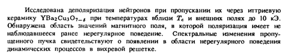 Исследована деполяризация нейтронов при пропускании их через иттриевую керамику УВагСиз07_^ при температурах вблизи Тс и внешних полях до 10 кЭ. Обнаружена область значений магнитного поля, в которой поляризация имеет не наблюдавшееся ранее нерегулярное поведение. Спектральные изменения пропущенного пучка свидетельствуют о появлении в области нерегулярного поведения динамических процессов в вихревой решетке.