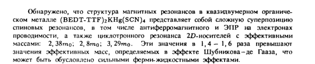 Обнаружено, что структура магнитных резонансов в квазидвумерном органическом металле (BEDT-TTF)2KHg(SCN)4 представляет собой сложную суперпозицию спиновых резонансов, в том числе антиферромагнитного и ЭПР на электронах проводимости, а также плклотронного резонанса 2£)-носителей с эффективными массами: 2, 38то; 2,8то; 3,29то. Эти значения в 1,4—1,6 раза превышают значения эффективных масс, определяемых в эффекте Шубникова—де Гааза, что может быть обусловлено сильными ферми-жидкостными эффектами.