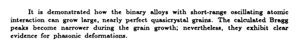 It is demonstrated how the binary alloys with short-range oscillating atomic interaction can grow large, nearly perfect quasicrystal grains. The calculated Bragg peaks become narrower during the grain growth; nevertheless, they exhibit clear evidence for phasonic deformations.