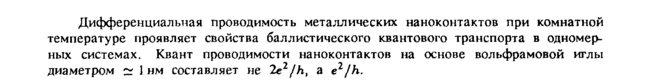 Дифференциальная проводимость металлических наноконтактов при комнатной температуре проявляет свойства баллистического квантового транспорта в одномерных системах. Квант проводимости наноконтактов на основе вольфрамовой иглы диаметром ~ 1 нм составляет не 2e2/h, а е2/Н,