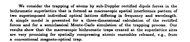 We consider the trapping of atoms by sub-Doppler rectified dipole forces in the Dichromatic superlattice that is formed as macroscopic spatial interference pattern of two superimposed individual optical lattices differing in frequency and wavelength. A simple model is presented for a three-dimensional calculation of the rectified forces and for a semiclassical Monte-Carlo simulation of the trapping process. Our results show that the macroscopic bichromatic traps created at the superlattice sites are very promising for spatially compressing atomic ensembles released, e.g., from a conventional magneto-optical trap.